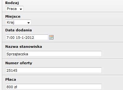Module allows adding work offers, trainings, courses, practices and more. Administrator has at his disposal an form with multiple fields defining offer. In it's composition they have e.g. offer type, place, date of adding, description, validity of offer.