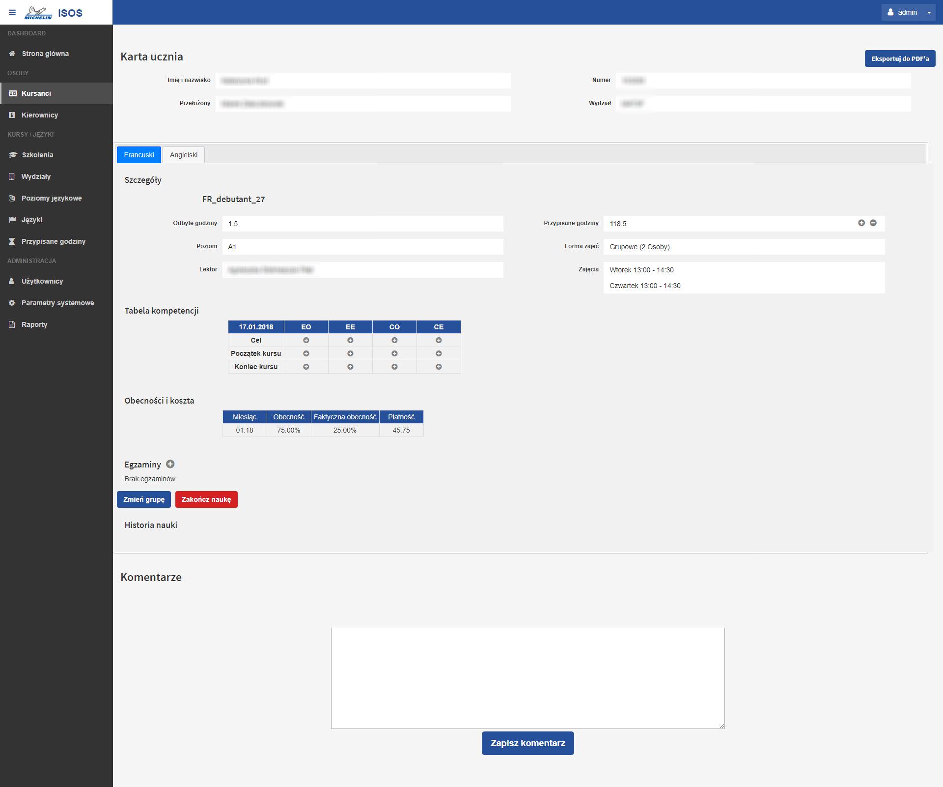 - Generowanie raportów i statysk ze szkoleń, frekwencji, wyników, kosztów